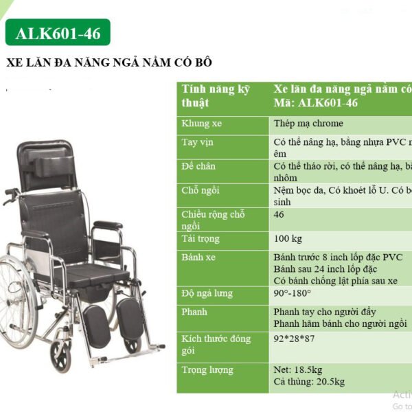 Xe lăn tay đa năng ngả nằm có bô ALK601GC-46 là thiết bị cao cấp tích hợp nhiều tính năng tạo sư thuận tiện tối đa cho người dùng: giúp bệnh nhân làm vệ sinh, tắm, gội trên xe; điều này mang lại sự tiền lợi vô cùng cho người nhà trong quá trình chăm sóc.